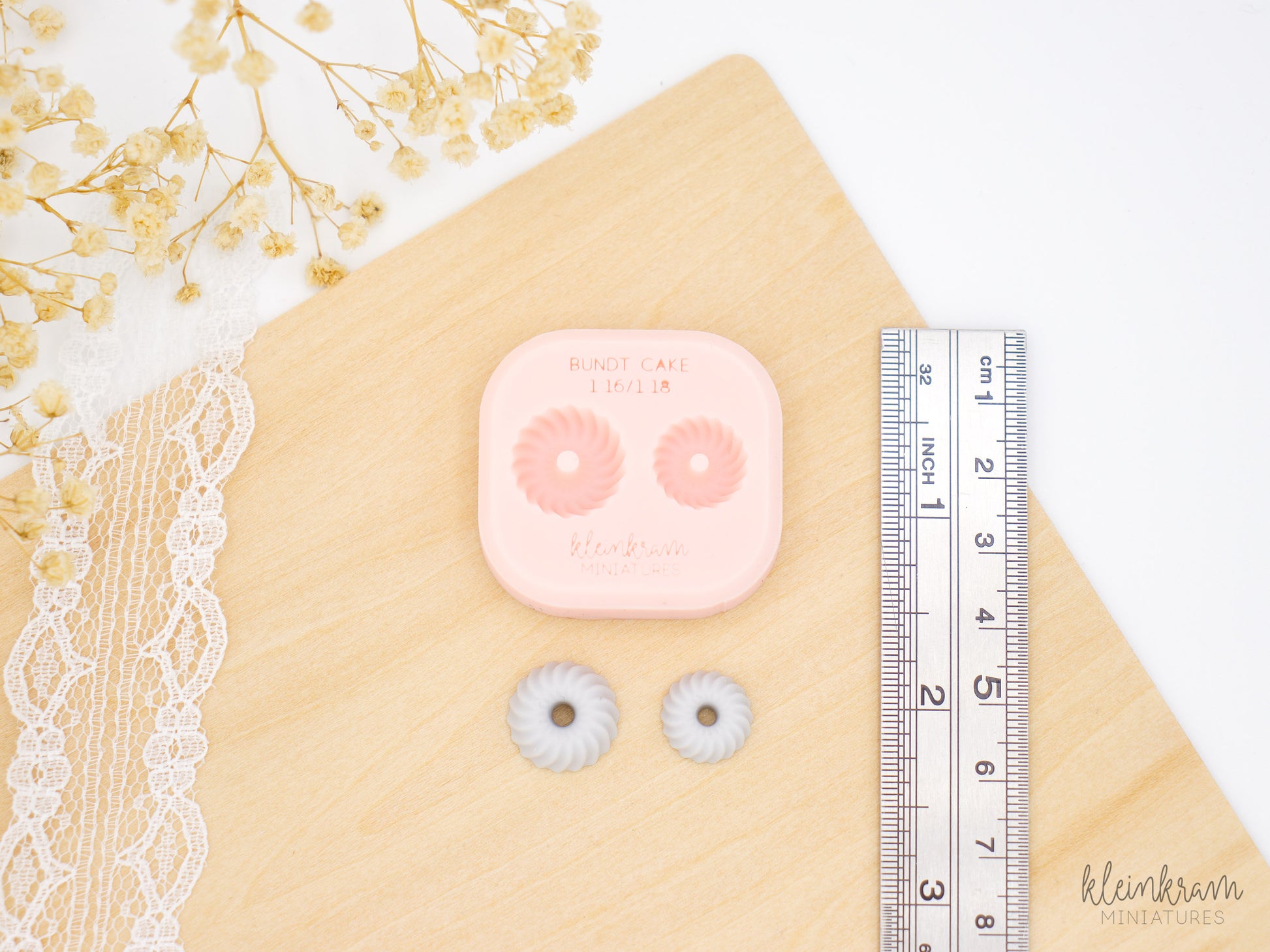 Mit dieser Silikonform können mittels Modelliermassen wie Fimo® ein Gugelhupf in zwei Größen passend für die Maßstäbe 1:16 und 1:18 (Calico Critters/Sylvanian Families, Lundby) hergestellt werden. Sie sind maßstabsgetreu und haben einen Durchmesser von ca. 14,5 mm bzw. 12 mm.