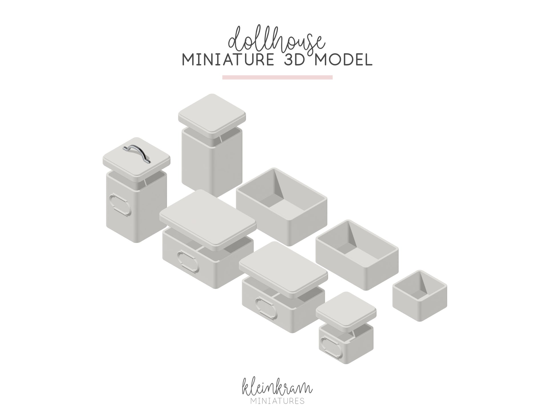 Mit dieser digitalen Datei in den Formaten STL und 3MF kannst du für dein Puppenhaus Miniatur Küchenbehälter in vier verschiedenen Größen auf deinem 3D-Drucker ausdrucken. Jede Box hat einen passenden Deckel dazu. Die Dateien sind im Maßstab 1:12 abgespeichert, können aber ohne Probleme vergrößert und auch ein wenig verkleinert werden.