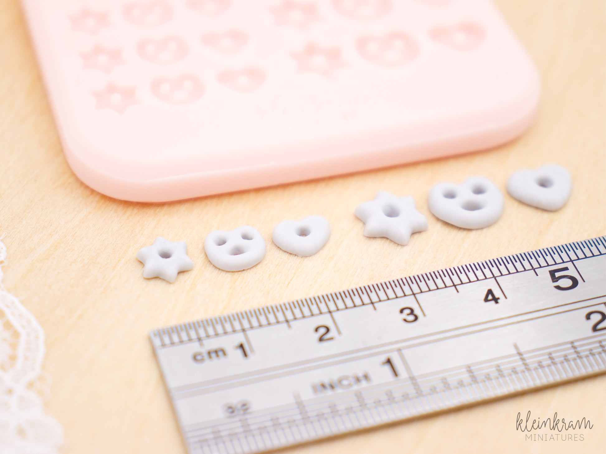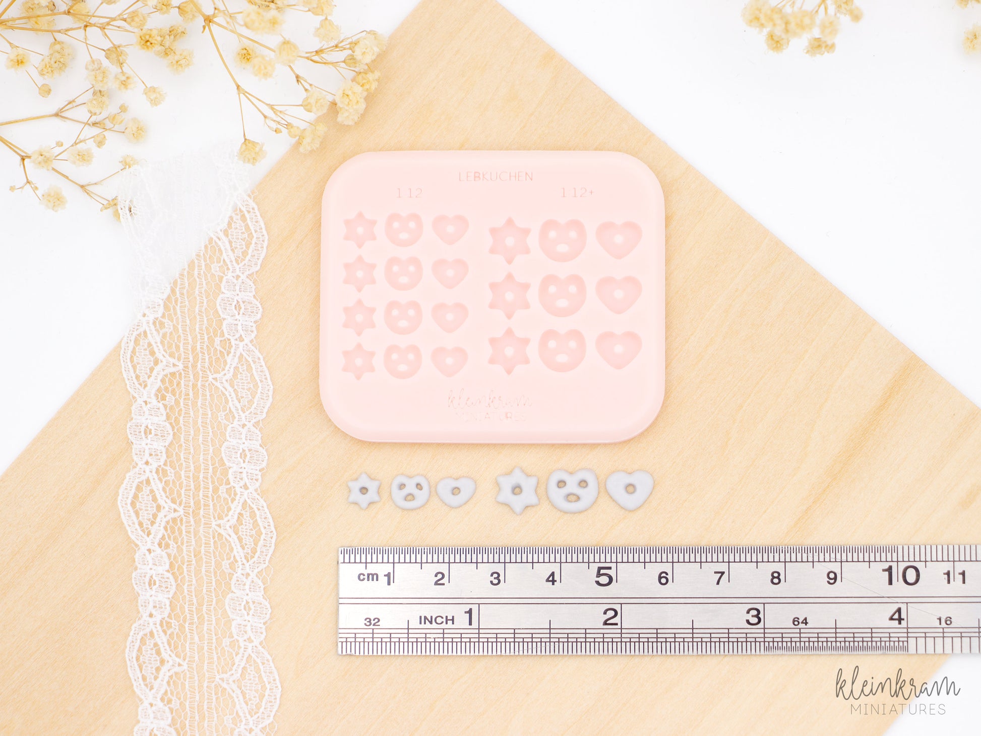 Mit dieser Silikonform können mittels Modelliermassen wie Fimo® Lebkuchen in den Formen Herz, Stern und Breze in zwei Größen passend für den Maßstab 1:12 hergestellt werden. Die einzelnen abgeformten Lebkuchen sind maßstabsgetreu und haben einen Durchmesser von ca. 8 mm bzw. 6 mm.