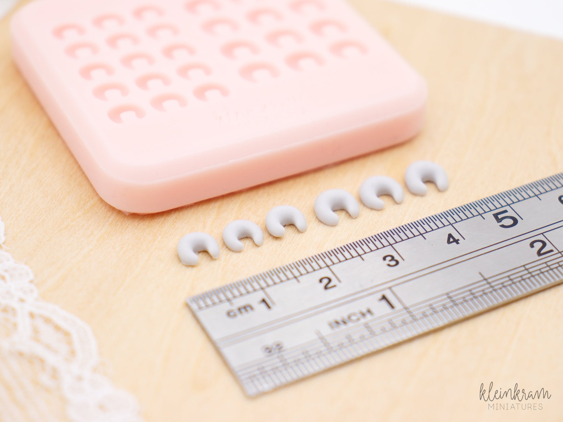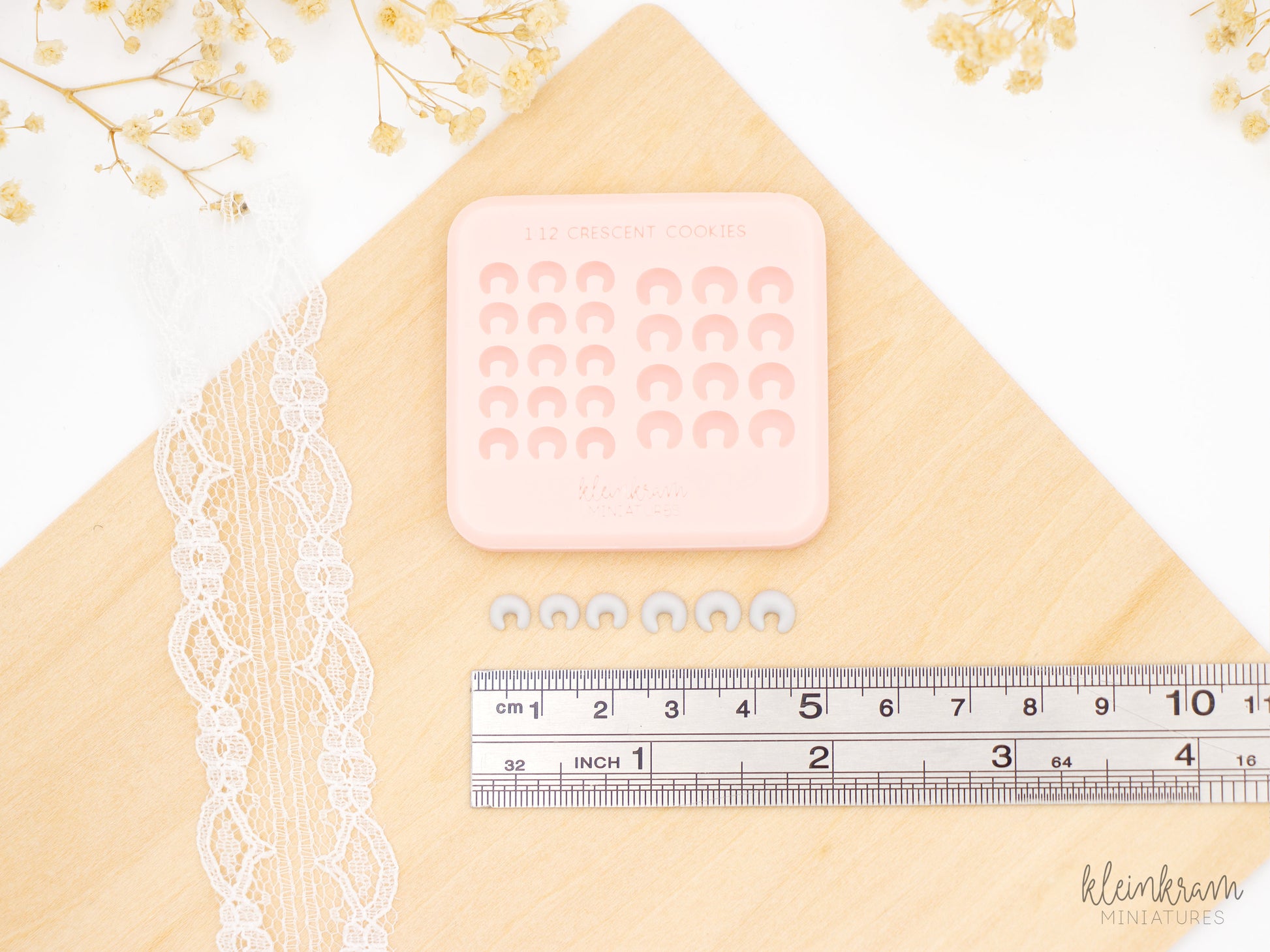 Mit dieser Silikonform können mittels Modelliermassen wie Fimo® Vanillekipferl in zwei Größen passend für den Maßstab 1:12 hergestellt werden. Die einzelnen abgeformten Kipferl sind maßstabsgetreu und sind in etwa 6,5 mm bzw. 5 mm breit.